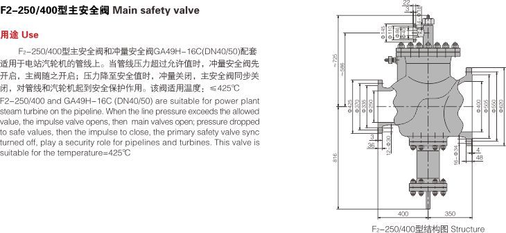 F2-250/400型主安全閥和沖量安全閥GA49H-16(DN40/50)配套適用于電站汽輪機的管線上。當管線壓力超過允許值時,沖量安全閥先開啟,主閥隨之開啟;壓力降至安全值時,沖量關閉,主安全閥同步關閉,對管線和汽輪機起到安全保護作用。該閥適用溫度:≤425°C